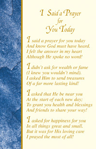” I said a prayer for you today – and know God must have heard – I felt the answer in my heart – although He spoke no word – I didn’t ask for wealth or fame – I knew you wouldn’t mind – I asked Him to send treasures – of a far more lasting kind – I asked that He be near you – at the start of each new day – to grant you health and blessings – and friends to share your day – I asked for happiness for you – in all things great and small – but it was for His loving care – I prayed for most of all “