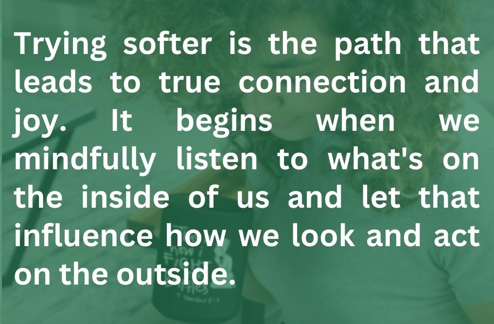 0r – put another way – “Trying softer is the path that leads to true connection and joy. It begins when we mindfully listen to what’s on the inside of us – and let that influence how we look and act – on the outside”