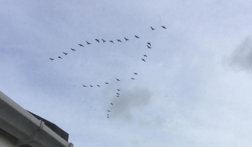 For – while I was away – I observed a wonderful sight two or three times every day – it was of lots of geese – in what I would have called – ‘gaggles’ – but in fact found out are called ‘skeins’ – ‘teams’ – or ‘wedges’ – flying overhead – accompanied by loud honking.