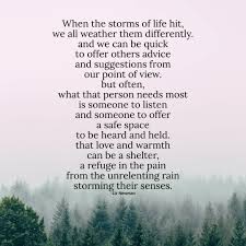 In fact – it’s often simply a case of just – ‘being there – as this quote says – “When the storms of life hit – we all weather them differently – and we can be quick to offer others advice and suggestion from our point of view – but often – what that person needs most – is someone to listen – and someone to offer a safe space – to be heard and held – that – love and warmth can be a shelter – a refuge in the pain – from the unrelenting rain – storming their senses”.