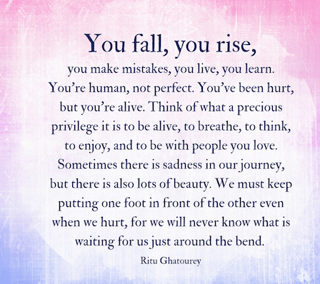 Or maybe this puts it better – “You fall – you rise – you make mistakes – you live – you learn. You’re human – not perfect. You’ve been hurt – but you’re alive. Think of what a precious privilege it is to be alive – to breathe – to think – to enjoy – and to be with people you love. Sometimes there is sadness in your journey – but there is also lots of beauty. We must keep putting one foot in front of the other – even when we hurt – for we will never know what is waiting for us – just around the bend”