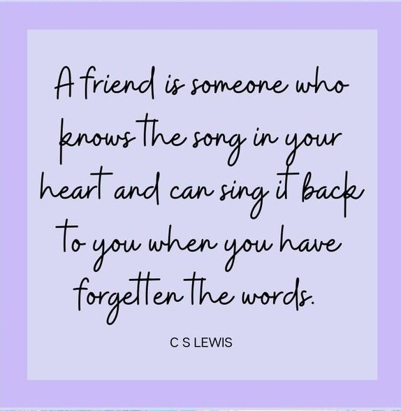 At a recent wedding anniversary celebration – each guest was given an envelope – with a card inside – inscribed with this quote from C S Lewis – “A friend is someone who knows the song in your heart – and can sing it back to you – when you have forgotten the words”.
