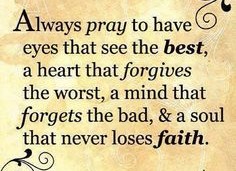 And so – this week my prayer is – that I may always have eyes that see – or as this quote says – “Always pray to have eyes to see the best – a heart that forgives the worst – a mind that forgets the bad – and a soul that never loses faith”.
