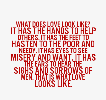 That I think – is the essence of love – as described here – “What does love look like? – it has the hands to help others – it has the feet to hasten to the poor and needy – it has the eyes to see misery and want – it has the ears to hear the sighs and sorrows of men – that is what love looks like”.