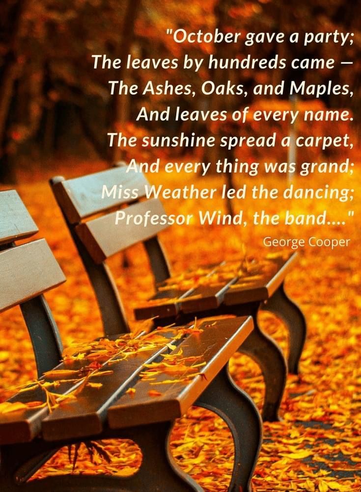 I love the way that so many have expressed this wonder – this beauty – causing Autumn – to speak to me in so many ways. One such example being the following – “October gave a party – their leaves by hundreds came – the ashes – oaks – and maples – and leaves of every name. The sunshine spread a carpet – and everything was grand – Miss Weather led the dancing – Professor Wind the band”.