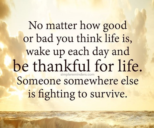 Life can be hard for us all – that is life – but – “No matter how good – or how bad – you think life is- wake up each day – and be thankful. Someone – somewhere else – is fighting to survive”.