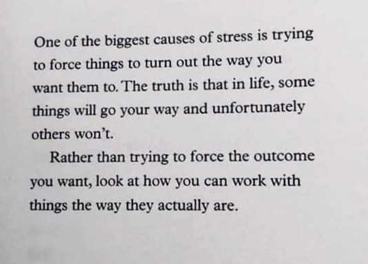 “One of the biggest causes of stress – is trying to force things to turn out the way you want them to – the truth is – that in life – some things will go your way – and unfortunately others won’t . Rather than trying to force the outcome you want – look at how you can work with things – the way they actually are”.