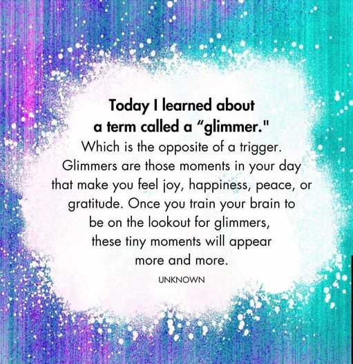 “Today – I learned about a term called a ‘glimmer’ – which is the opposite of a trigger. Glimmers are those moments in your day – that make you feel joy – happiness – peace – or gratitude. Once you train your brain to be on the lookout for glimmers – those tiny moments will appear more and more”