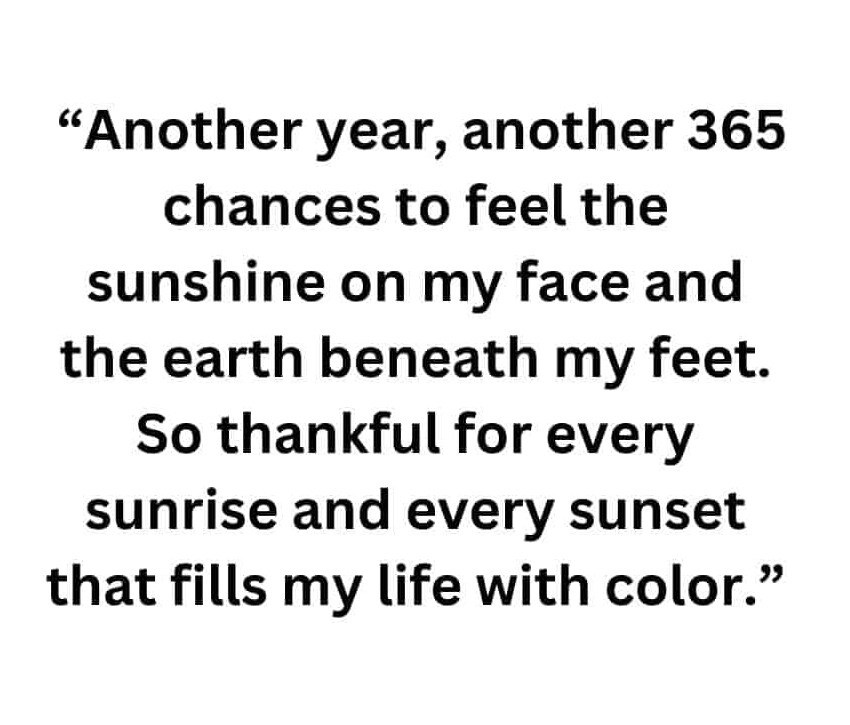 “Another year – maybe – another 365 chances – to feel the sunshine on my face – and the earth beneath my feet – to be thankful for every sunrise – and every sunset – that fills my life with colour”.
